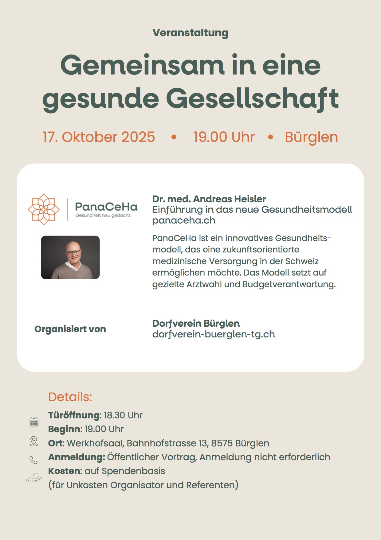 Vortrag mit Dr. Andreas Heisler über das neue Schweizer Gesundheitsmodell PanaCeHa